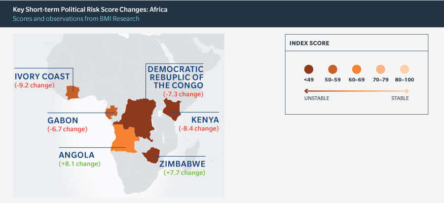 However, uncertainty around elections and successions led to sharp increases in political risk in several countries. Kenya and Gabon both recently experienced contested elections, and Cote d’Ivoire has seen political risk rise off the back of political jockeying to succeed President Alassane Outtara in 2020, while army mutinies continue in the country. Meanwhile, the Democratic Republic of the Congo (DRC) remains one of the most unstable countries, according to BMI Research. The country’s STPRI score fell further since the last update, from 32.7 to 25.4, as a result of uncertainty over when elections will be held, the weakening authority of President Joseph Kabila, and an increase in violence by armed groups.