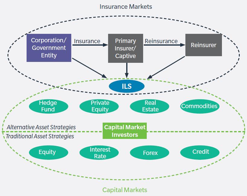 ILS is another form of reinsurance available to insurance entities. However, instead of facing a rated balance sheet, the insurance entity faces a fully secure, collateralized form of funding dedicated to a precise risk requiring coverage. Usually the collateral takes the form of highly-rated, highly-liquid investments, such as government gilt funds or pure money market funds. Premium flows are determined by the type of risk and investor appetite.