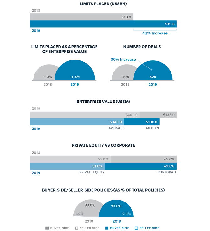 As the average enterprise value of transactions insured also increased, the average limit purchased was $42.8 million in 2019 ($29.9 million in 2018).