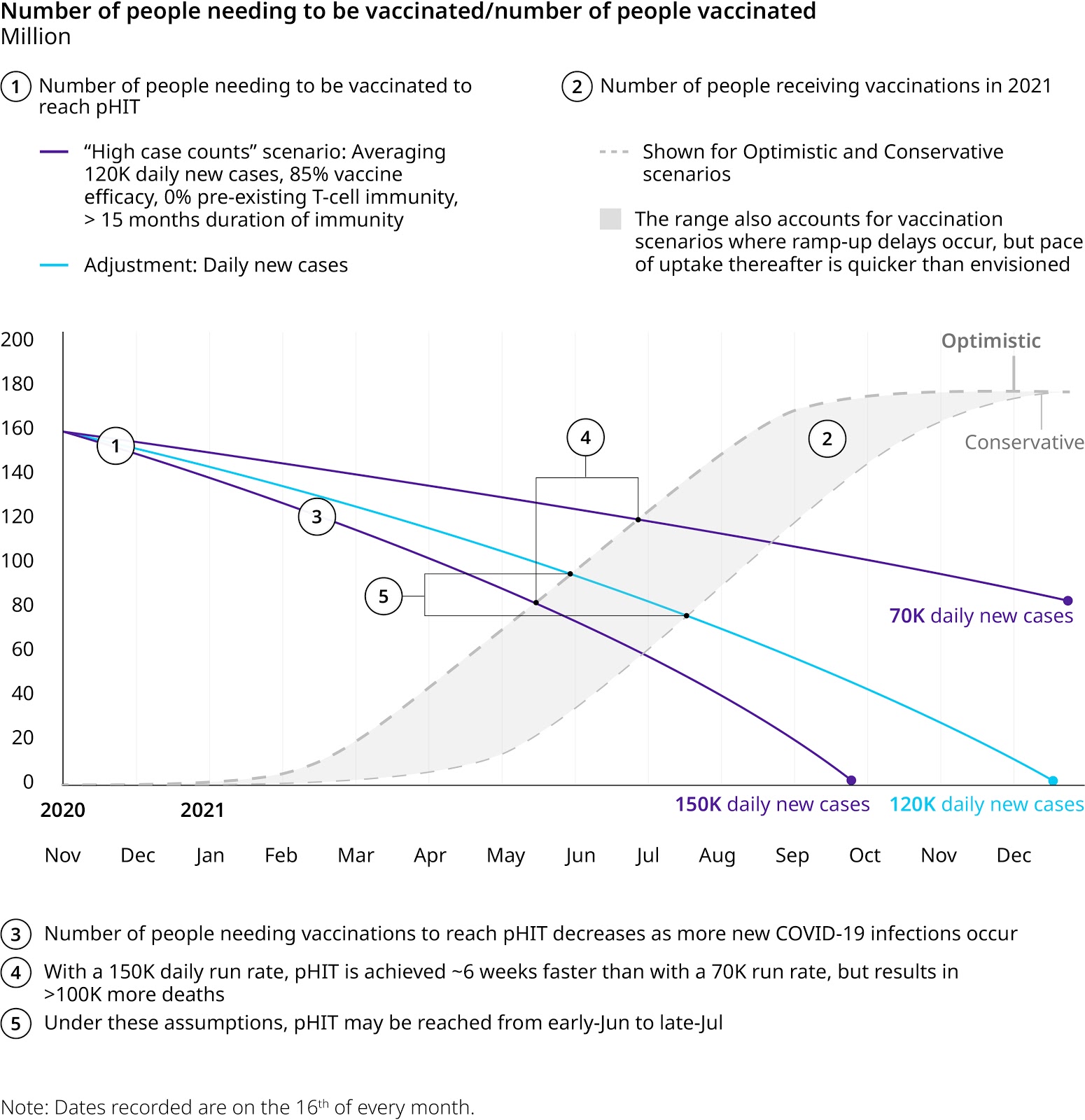 Moderna e Pfizer solicitaram autorizações de uso de emergência e estão se preparando para distribuir as primeiras doses. Pelo lado positivo, duas vacinas pioneiras reuniram dados suficientes para serem aprovados pelo FDA no final de novembro e ambas anunciaram que estão prontas para começar a vacinação já no final de dezembro. Se as vacinas forem aprovadas e a distribuição começar conforme planejado, o cronograma para pHIT diminui.