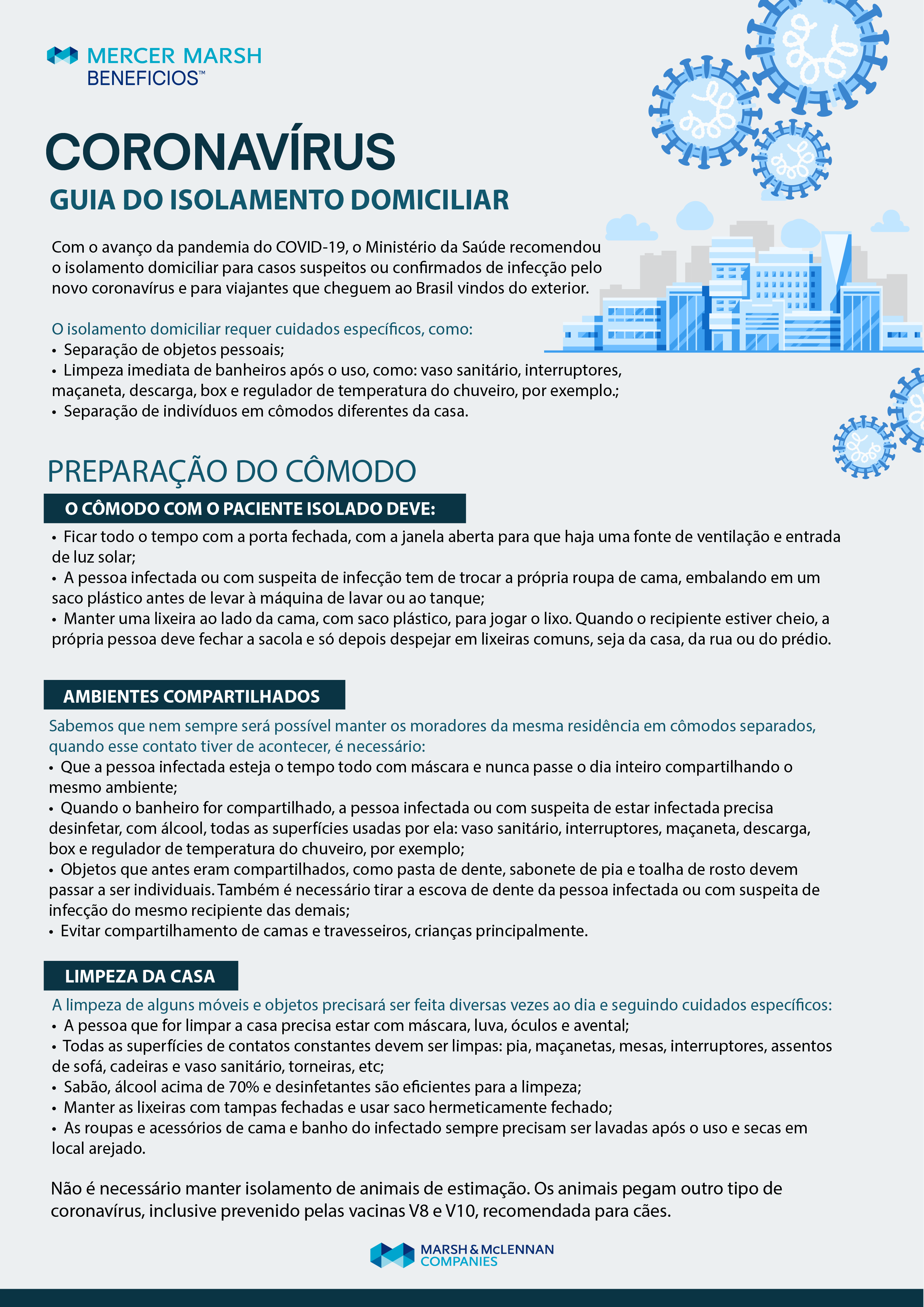 Com o avanço da pandemia do covid-19, o Ministério da Saúde recomendou o isolamento domiciliar para casos suspeitos ou con­firmados de infecção pelo coronavírus e para viajantes que cheguem ao Brasil vindos do exterior. A Mercer Marsh Benefícios preparou um guia que pode ajudar você e sua família a se preparar para caso essa ação seja necessária.